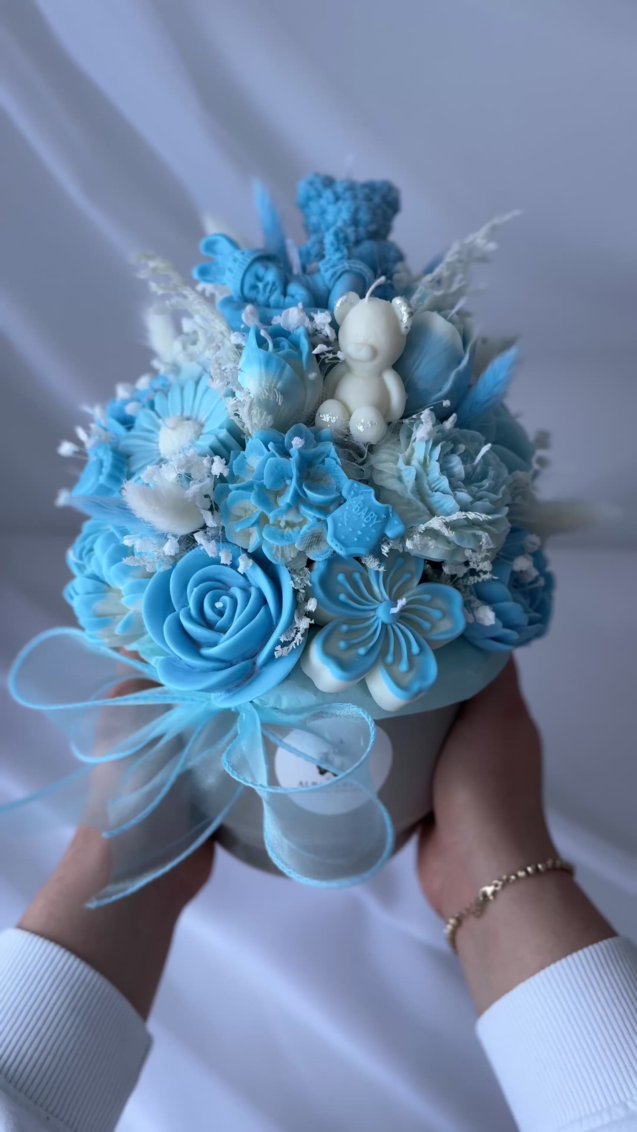 Zauberhafter Kerzenstrauss in Blau und Weiss mit süssem Teddy – das perfekte Geschenk zur Geburt eines Jungen. Handgefertigt mit liebevollen Details, Trockenblumen und zartem Schleifenband.